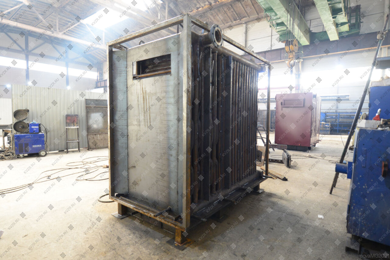Котел с водяными колосниками выполнен моноблоком – блок котла и ручная топка. Котельный блок представляет собой сварную конструкцию, состоящую из трубной системы (радиационной и конвективной поверхности нагрева), опорной рамы и каркаса с теплоизоляционными материалами, обшитого листовой сталью. Котлоагрегаты имеют П-образную сомкнутую компоновку. Топочная камера состоит из труб Ø 57x3,5 мм и выполнена газоплотной путем плавникового оребрения.